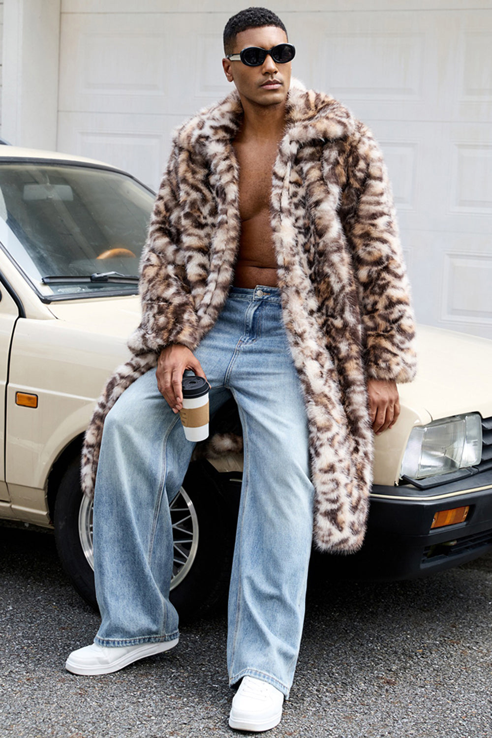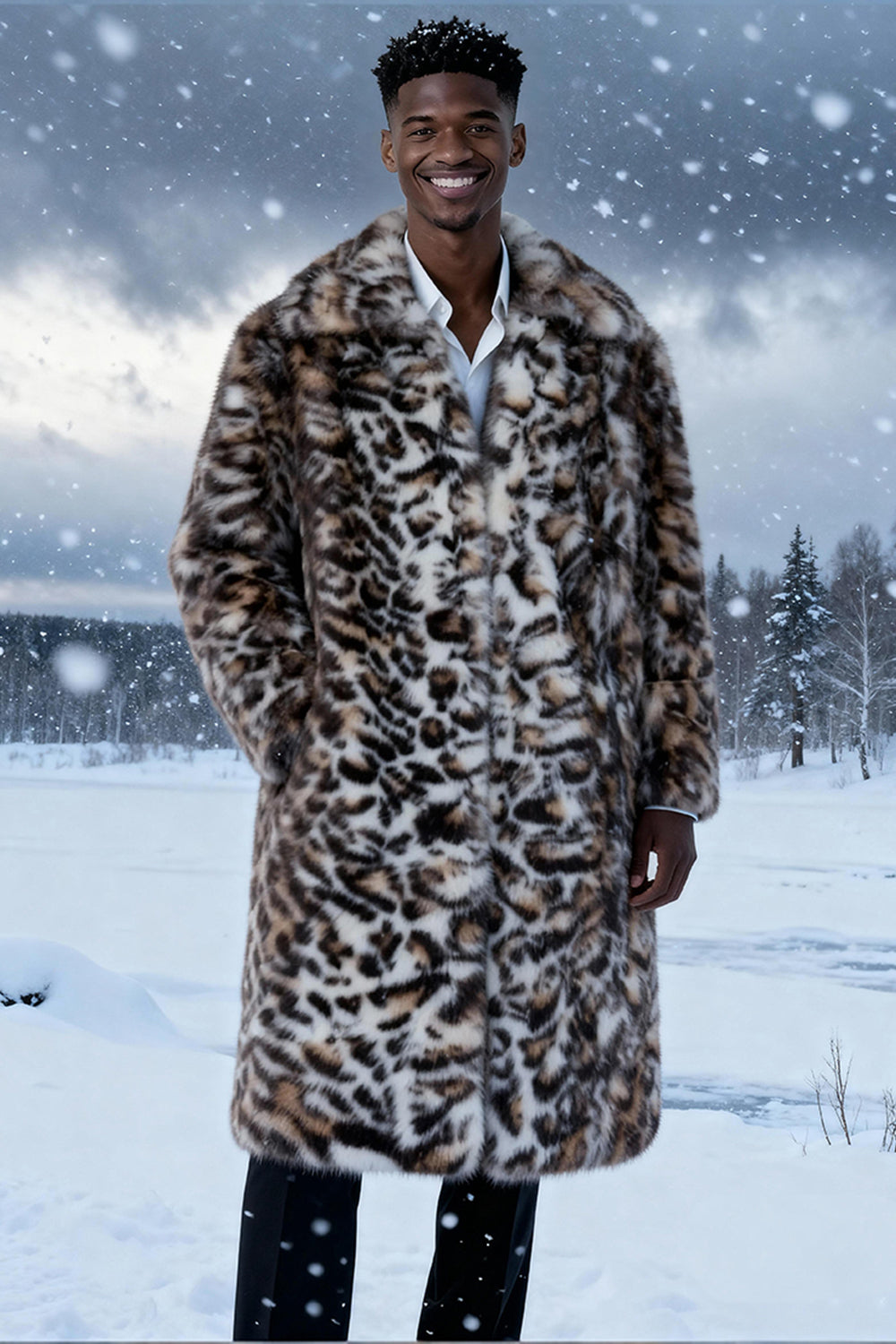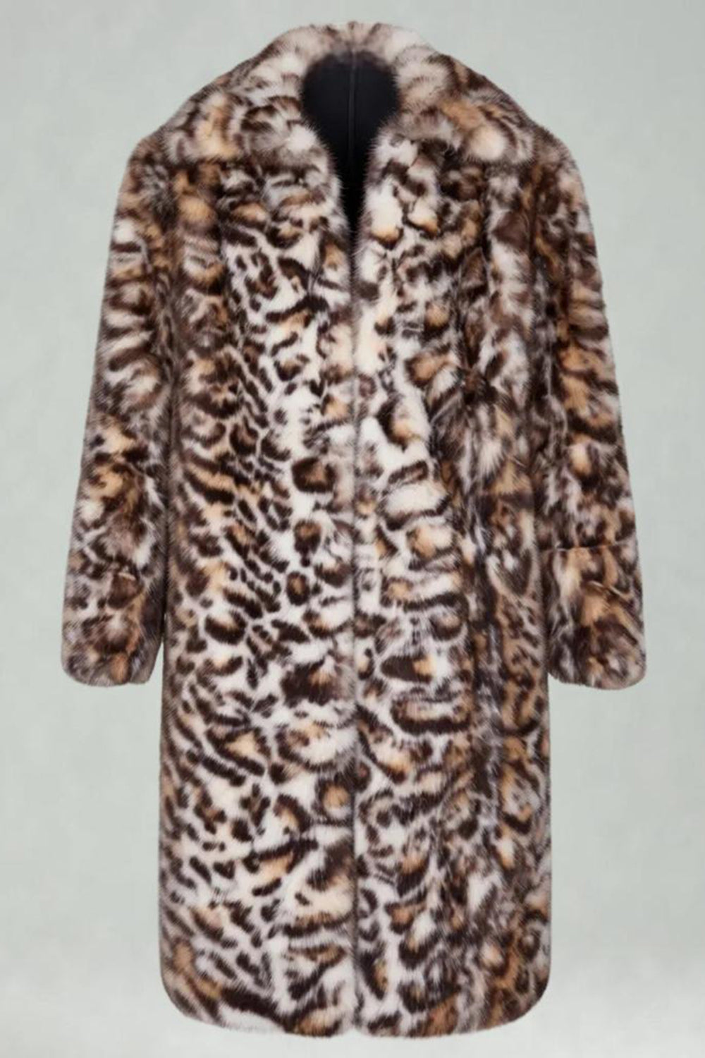 Pelaje sintético de leopardo marrón abierto delantero Abrigo largo de hombre