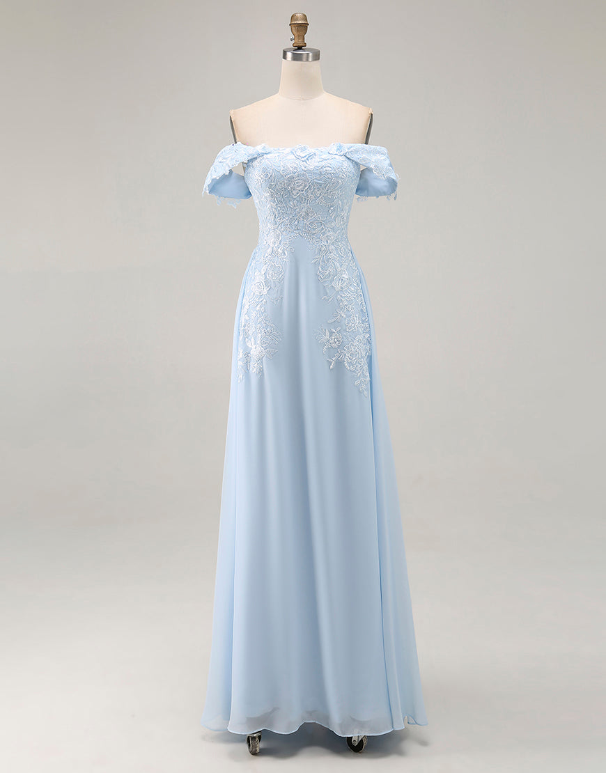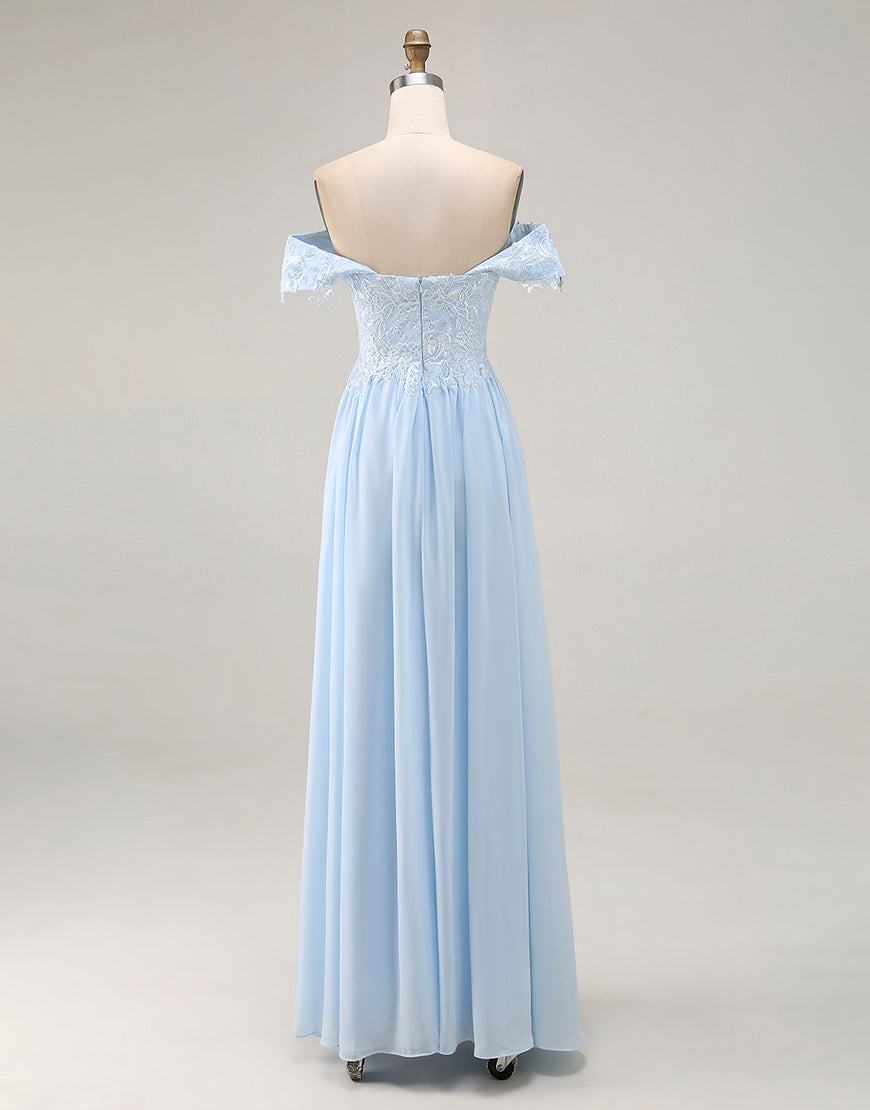 Elegante vaina de gasa azul cielo con hombros descubiertos madre larga de la novia con apliques de encaje