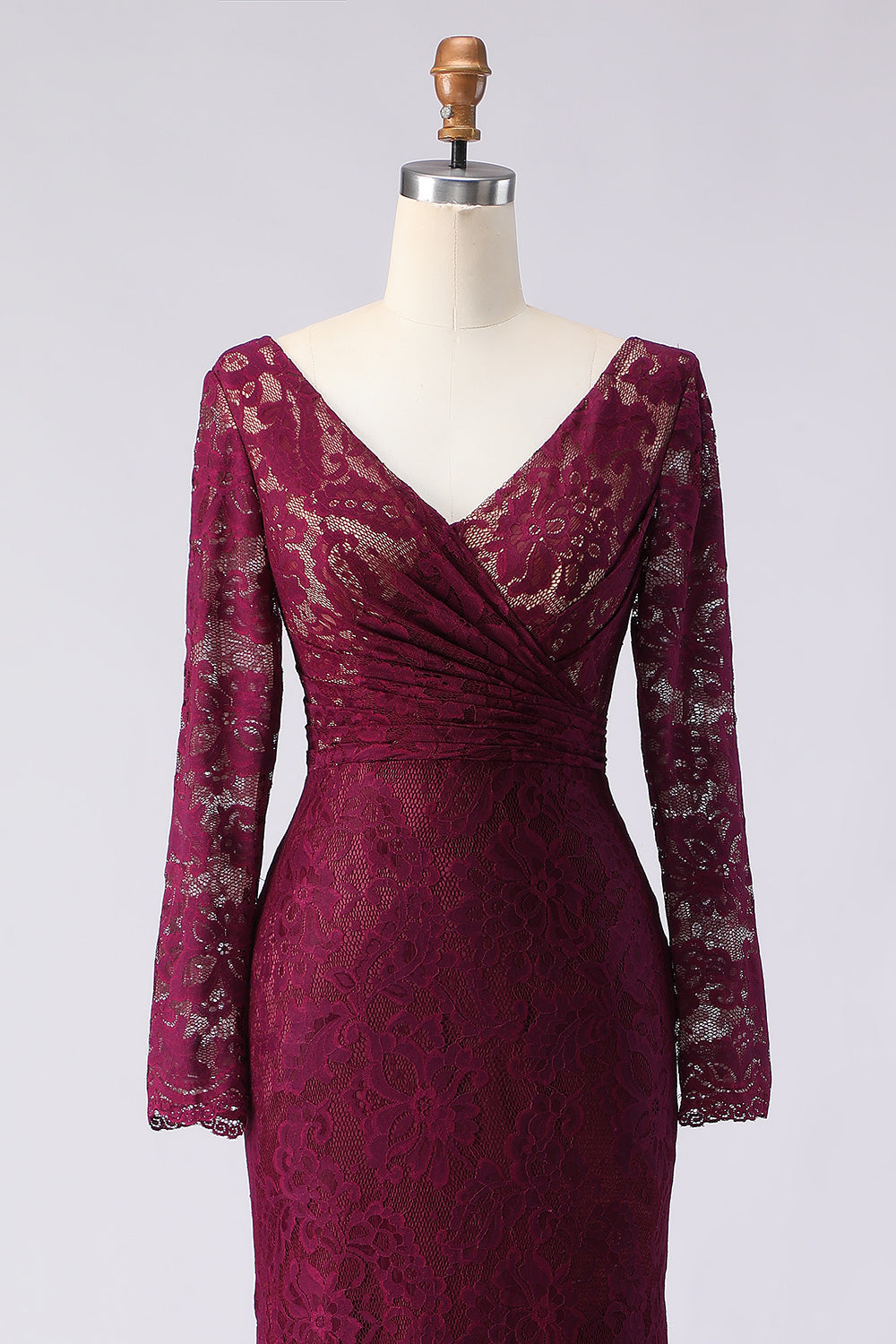 Vestido largo de madre de la novia con encaje cabernet con escote en V y escote en V
