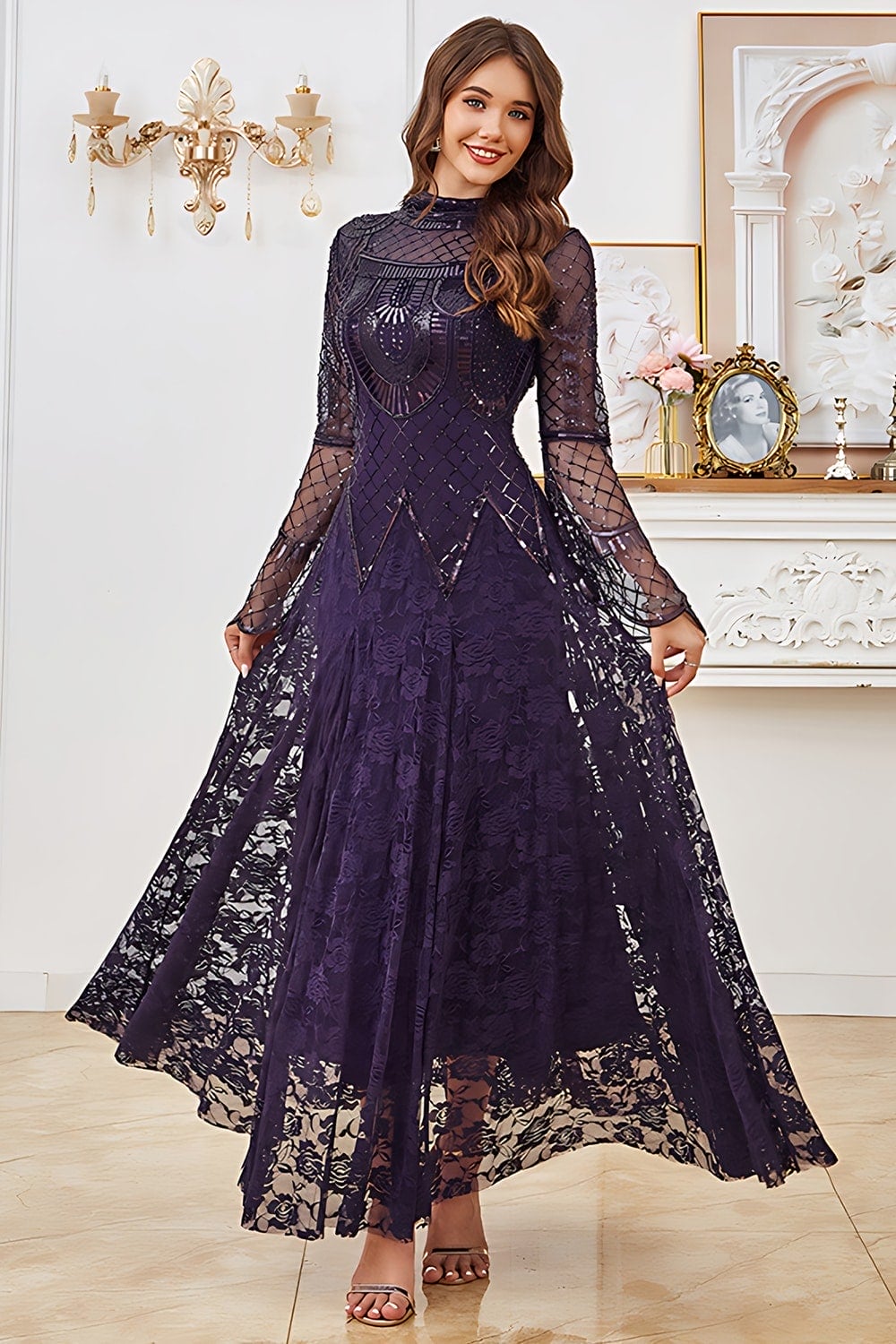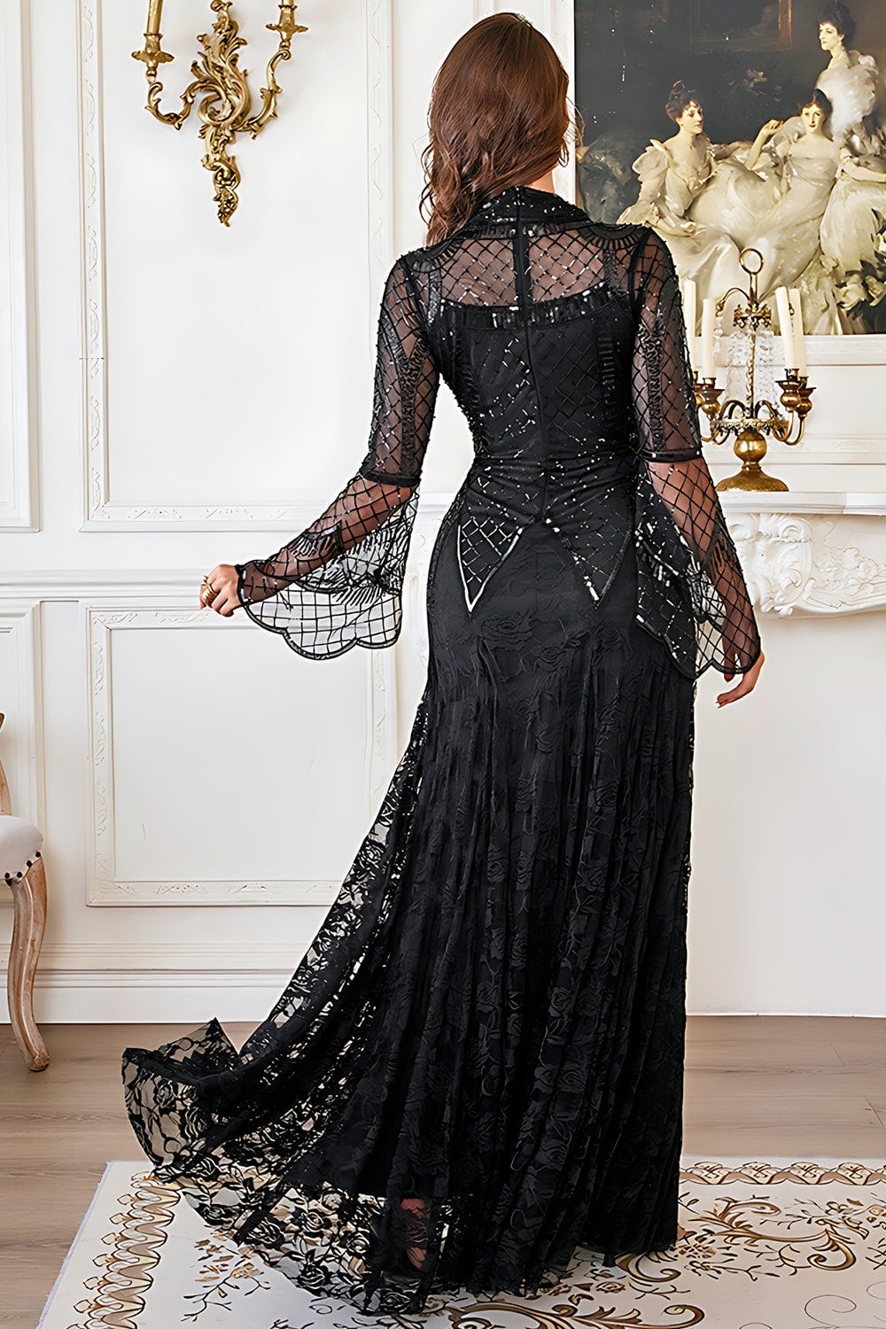 Vestido negro de manga larga con cuentas de encaje de la madre de la novia