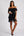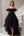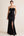 Vestido formal largo sin tirantes negro con volantes y abertura