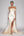 Vestido de fiesta largo con hombros descubiertos y champán brillante con abertura