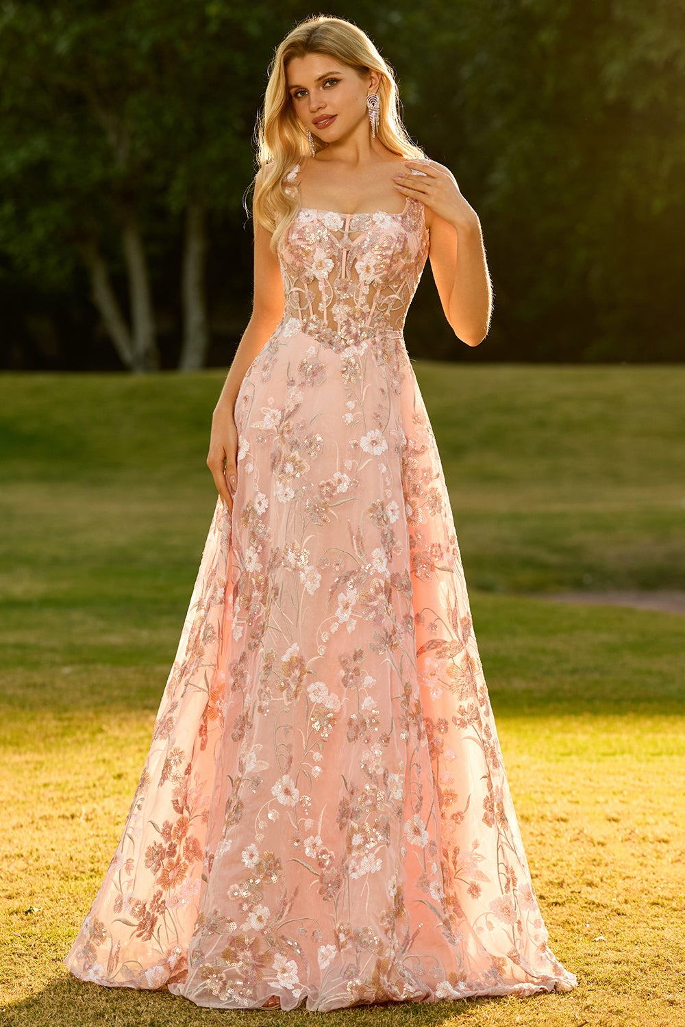 Corsé rosa: Una línea de vestido largo bordado con flores y lentejuelas