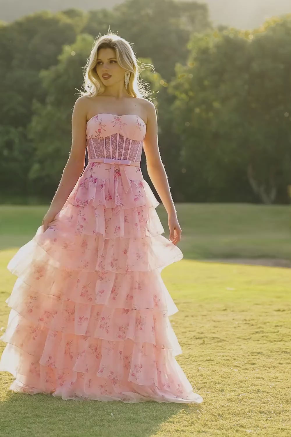 Vestido de graduación largo de graduación rosa sin tirantes florales de línea A con cuentas y pantalones