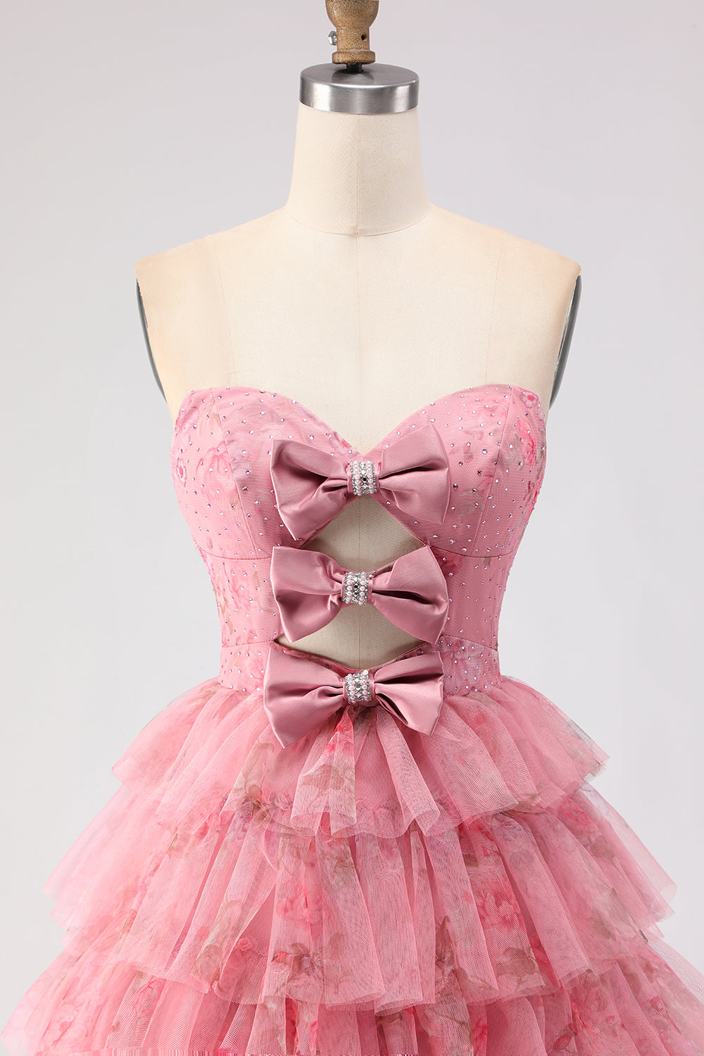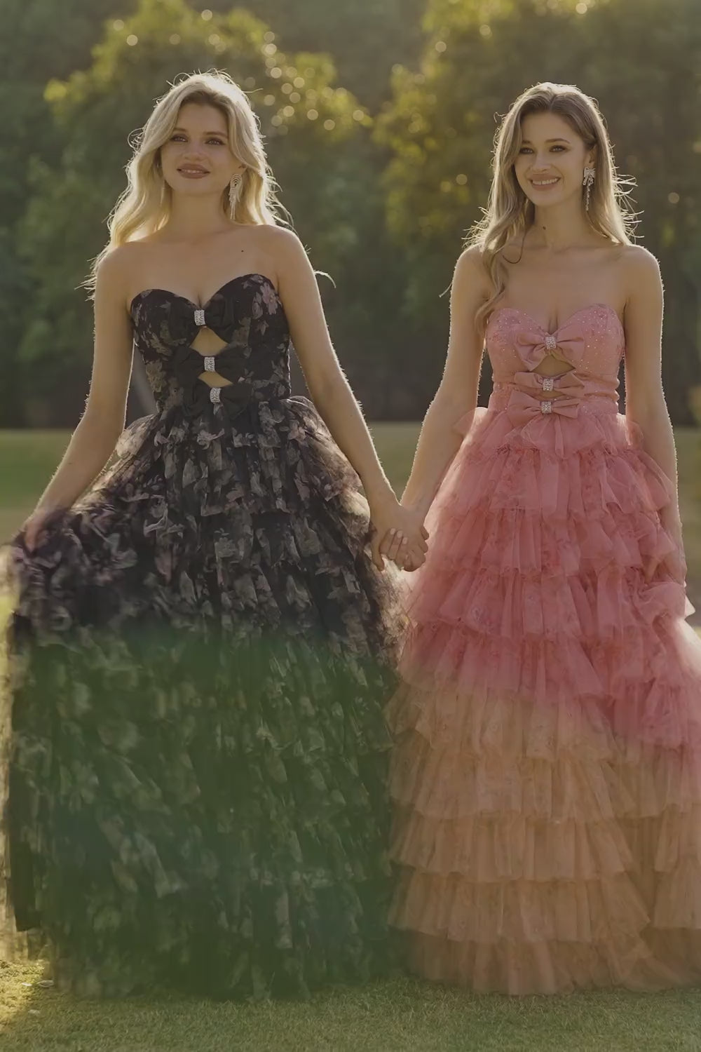 Vestido largo de graduación negro con volantes y volantes A-Line sin tirantes con lazos