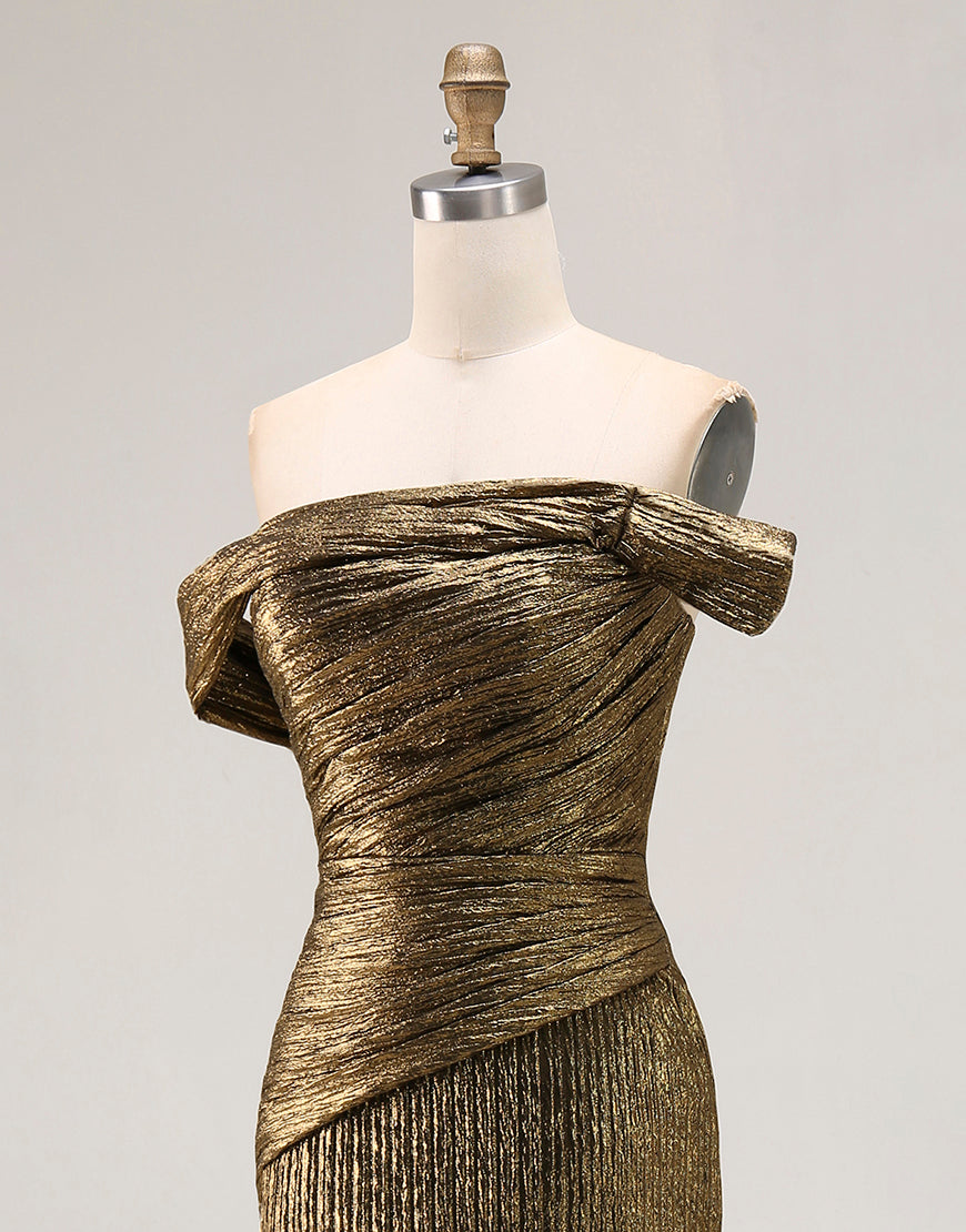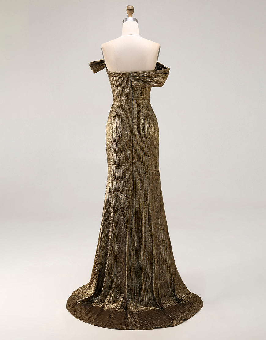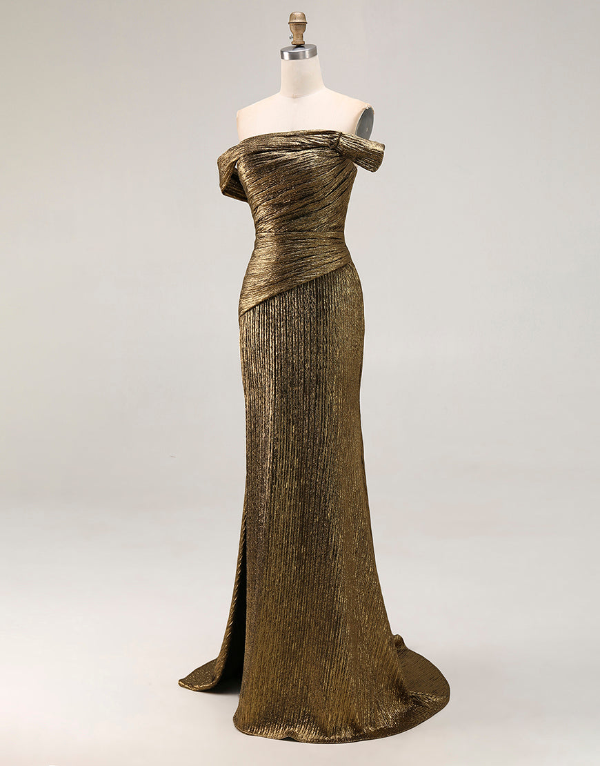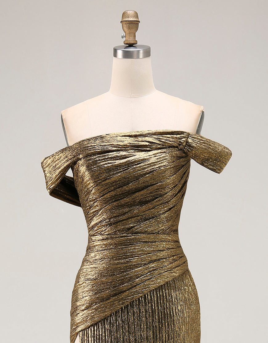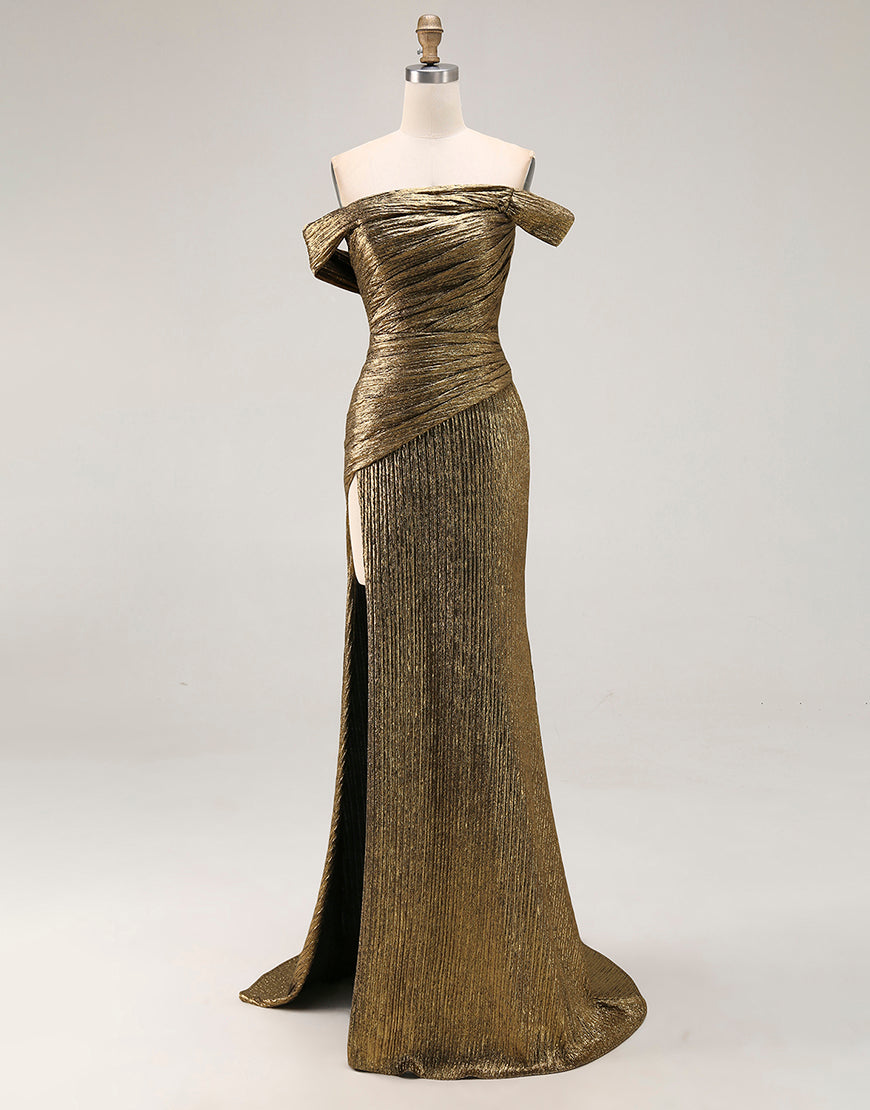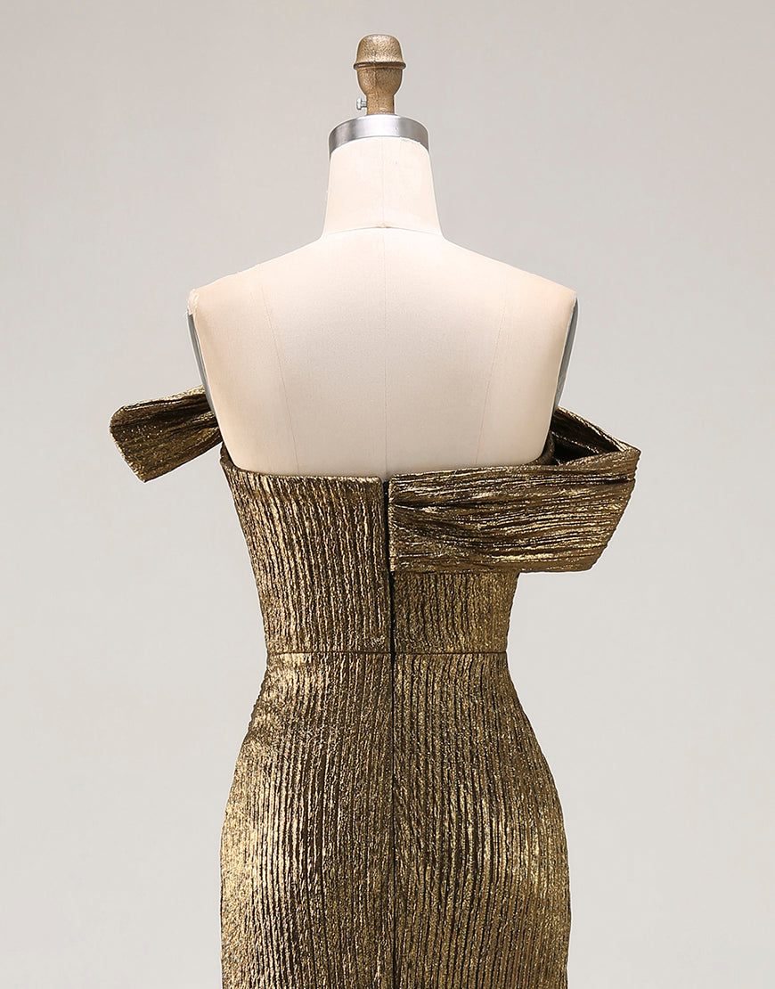 Vestido de fiesta de satén metálico con abertura y hombros descubiertos dorados