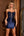 Vestido de cóctel corto con espalda abierta y corsé de lentejuelas azul con bordado