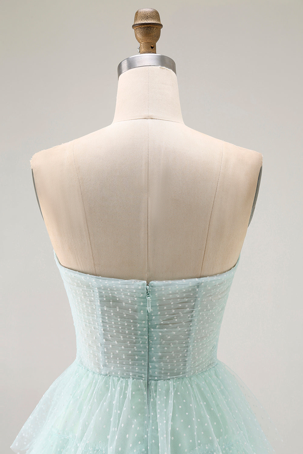 Vestido de dama de honor con volantes y volantes en línea A sin tirantes en verde claro con abertura