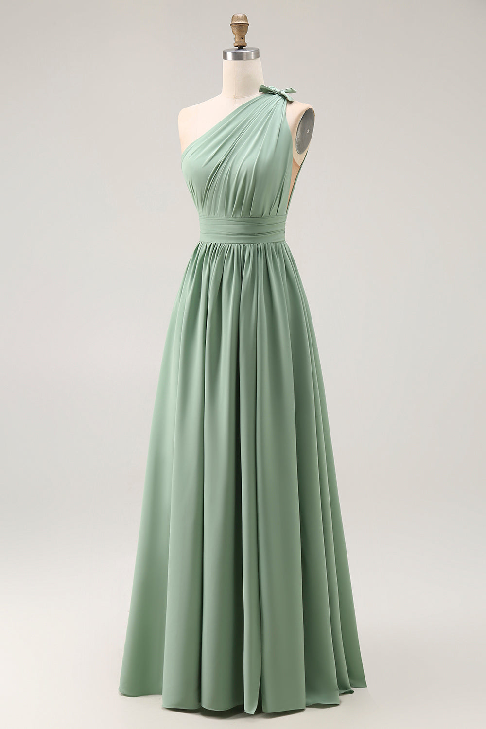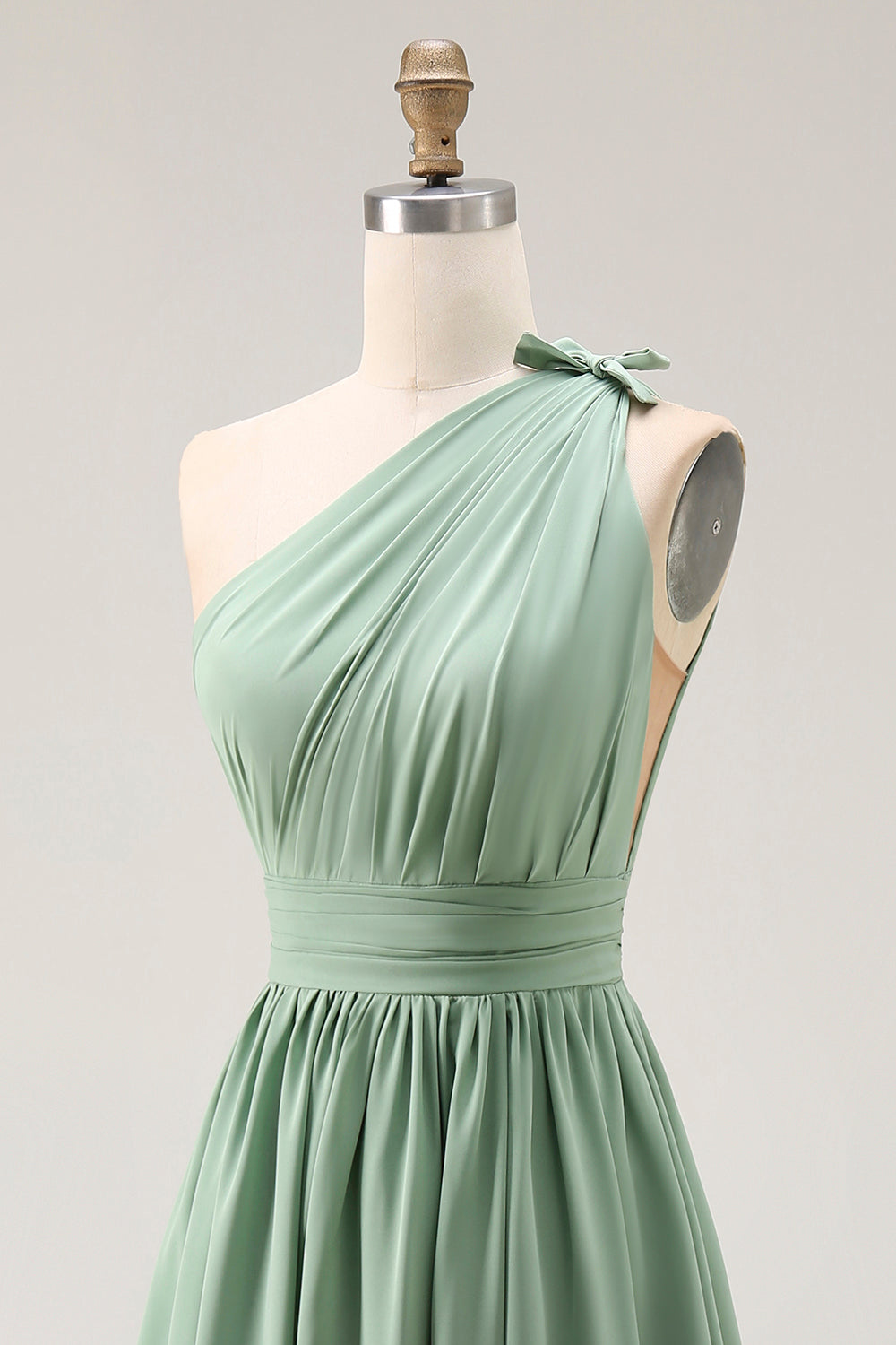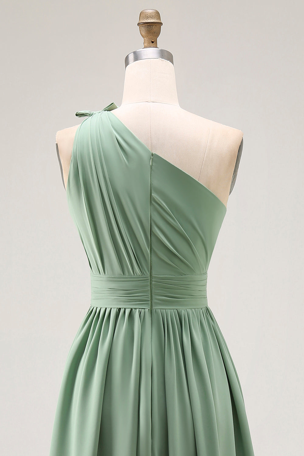 Vestido de dama de honor fruncido de un hombro con línea A verde con abertura