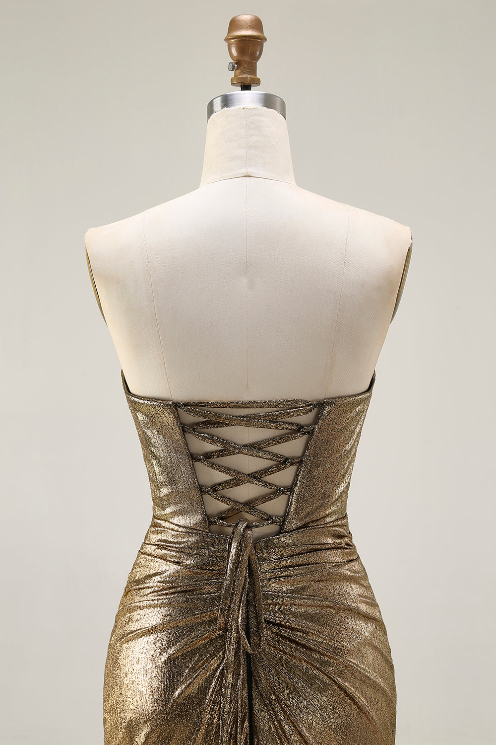 Vestido de Fiesta Largo Metálico Dorado Oscuro Sirena Sin Tirantes con Abertura