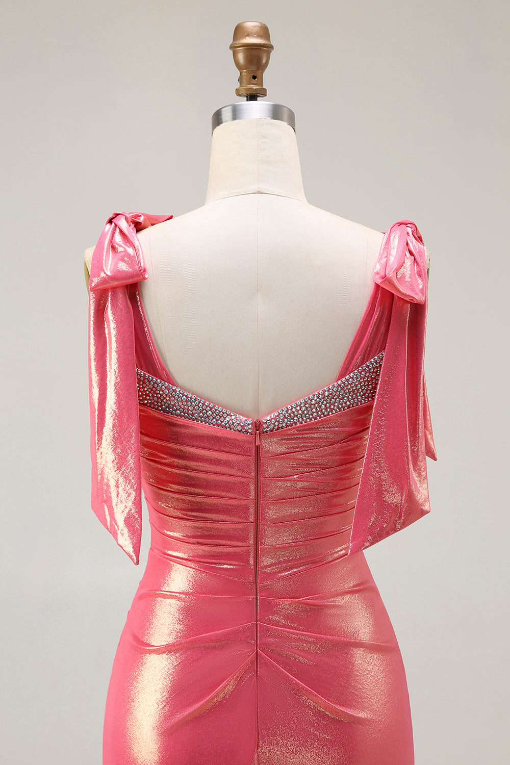 Vestido largo de fiesta con cuentas de sirena en coral metálico y abertura