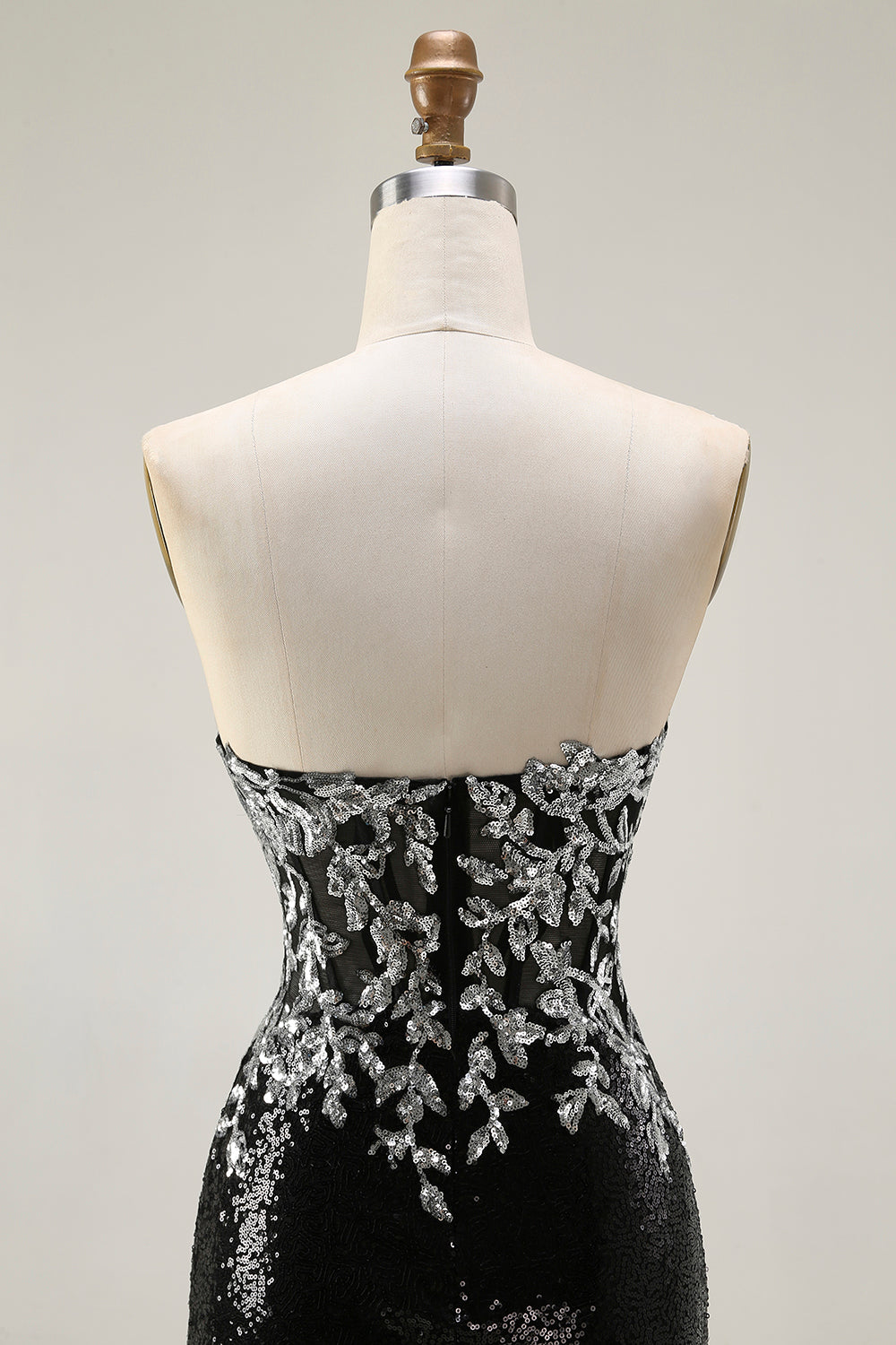 Vestido largo de fiesta sin tirantes con corsé de lentejuelas sirena plateada brillante