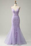 Tirantes de Espagueti Sirena Púrpura Vestido de Fiesta Con Apliques