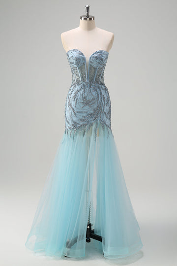 corsé sin tirantes de sirena azul claro brillante vestido de fiesta largo con cuentas y abertura