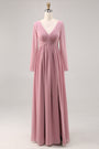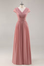 Vestido largo de dama de honor fruncido de gasa con hombros fríos rosa empolvado con abertura