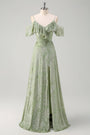 Vestido de fiesta largo de terciopelo quemado verde oscuro con mangas cortas