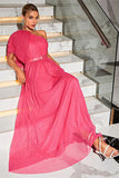 Vestido de fiesta largo de tul de un hombro coral con cinturón