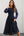 Vestido formal fruncido negro con cuello en V y lunares ajustados