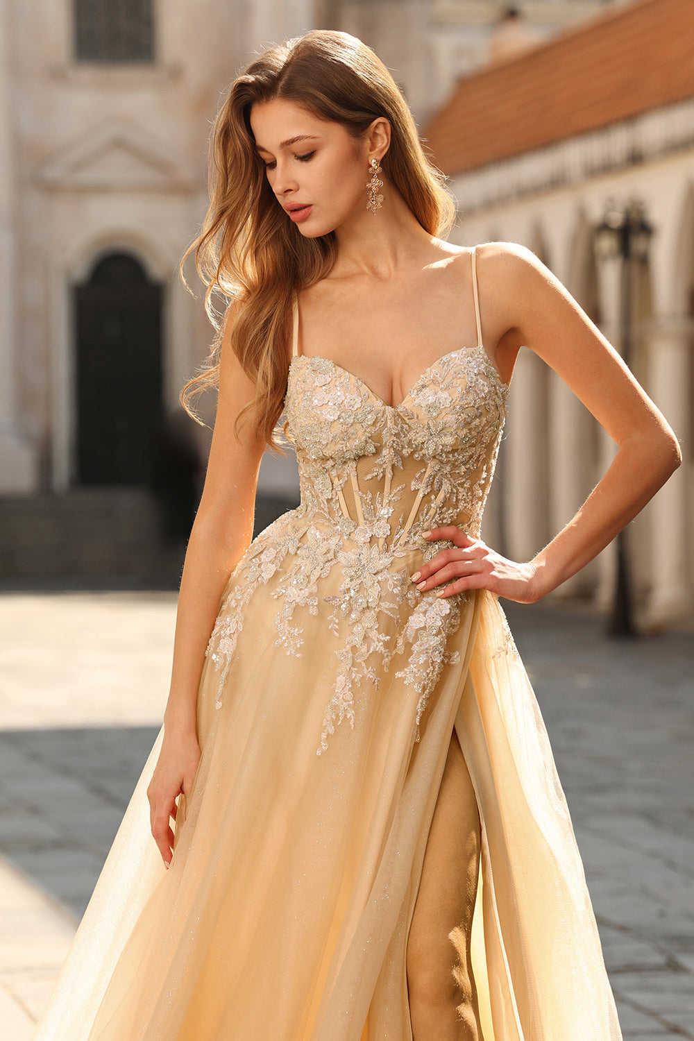 Corsé de cuentas con contas brillante, melocotón y lentejuelas, vestido largo de tul con abertura