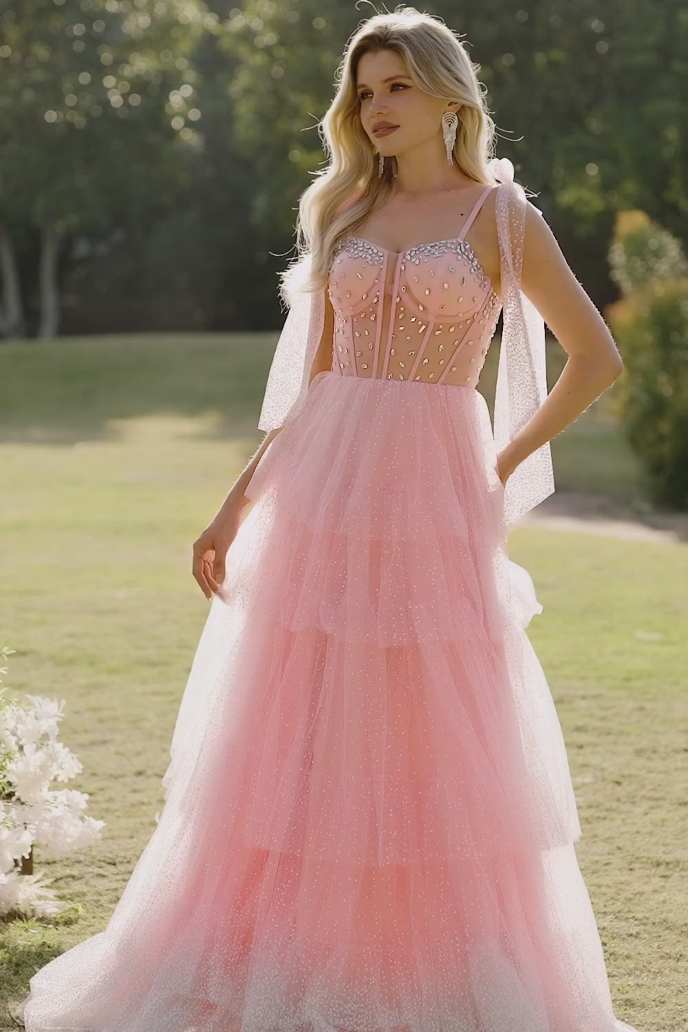 Corsé rosa Línea A, vestido largo de graduación con volantes y cuentas y encaje en la espalda