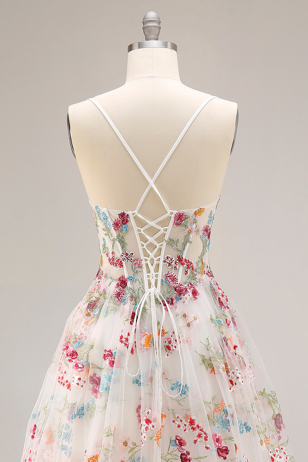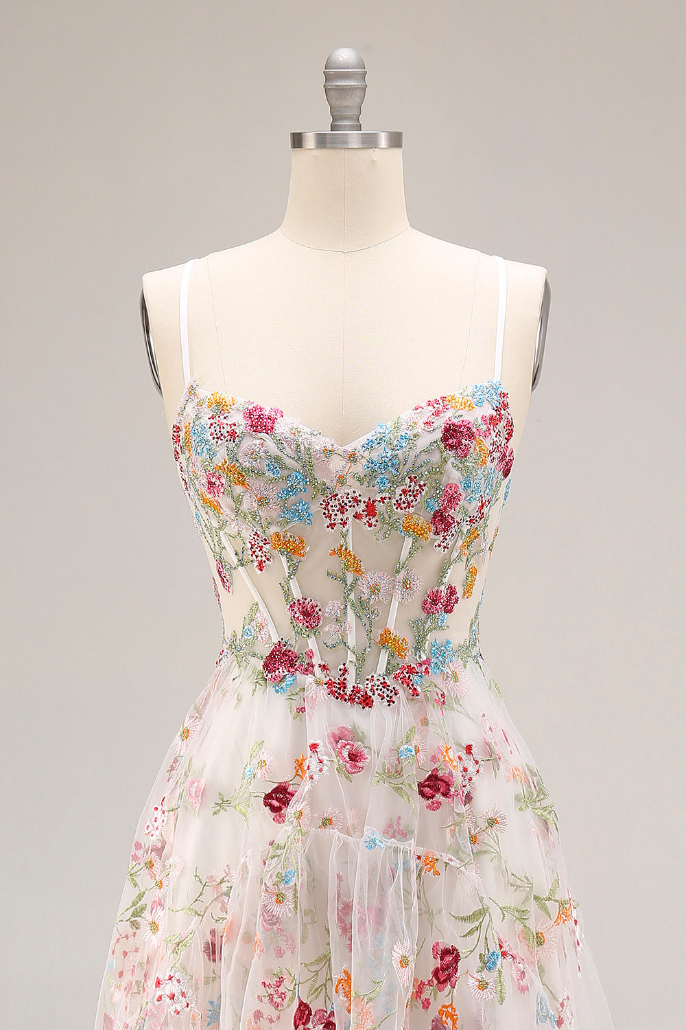 Marfil Línea A Corsé translúcido con espinas bordadas Vestido largo floral con abertura con volantes