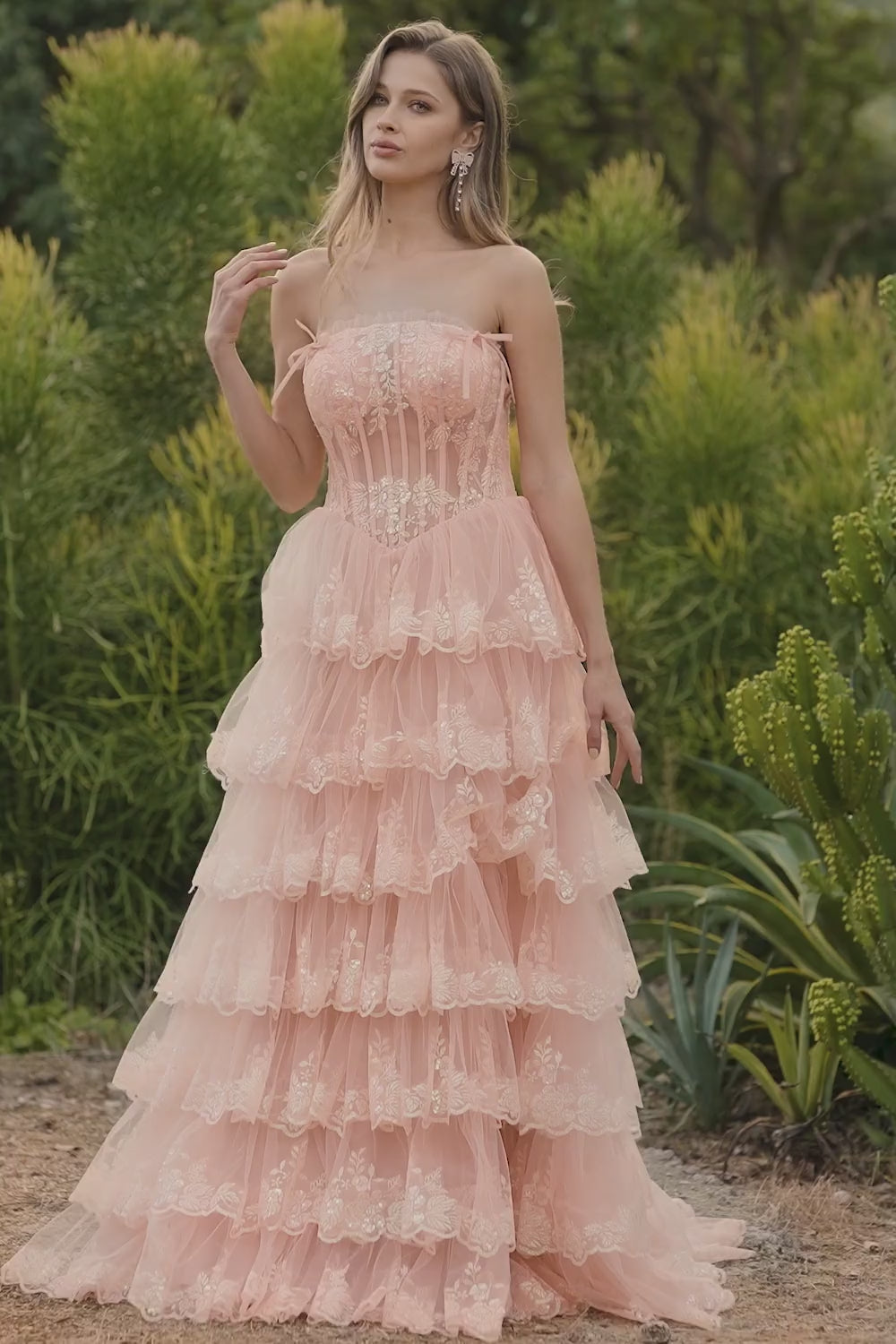 Rubor Tirantes Volantes de Línea A Corsé de Lentejuelas Vestido largo de graduación con abertura