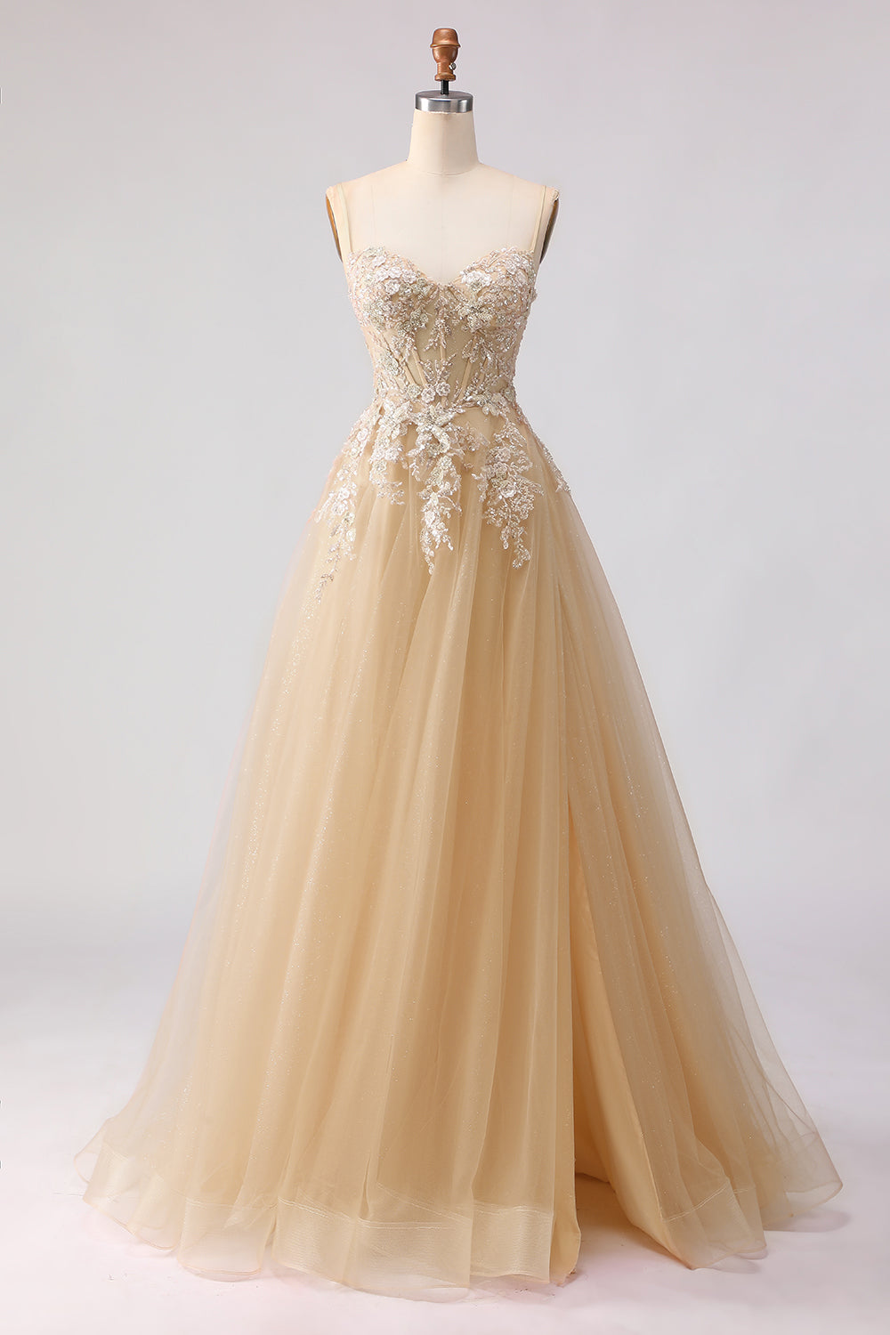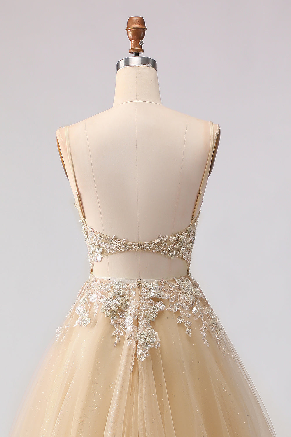 Vestido largo largo de graduación de tul con cuentas y Champán con puntas y línea A brillante y abertura