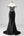 Vestido formal largo sin tirantes negro con volantes y abertura