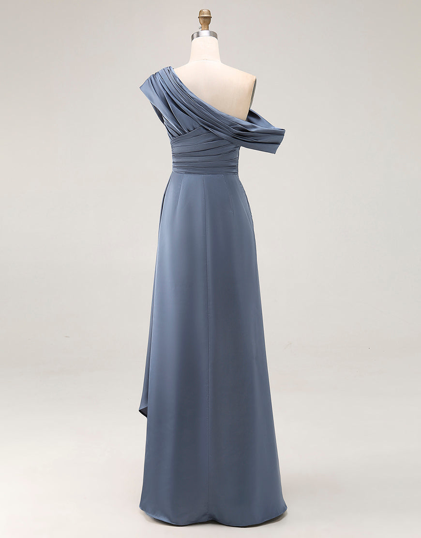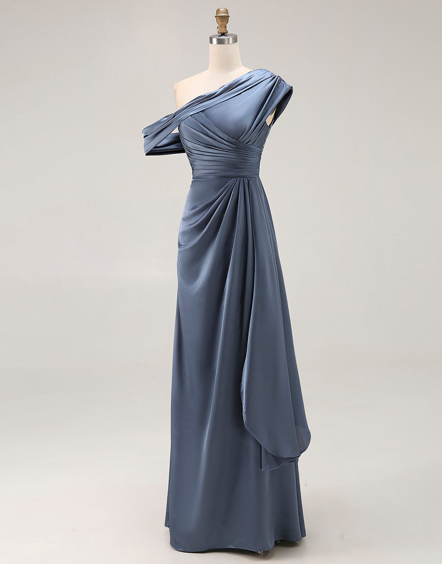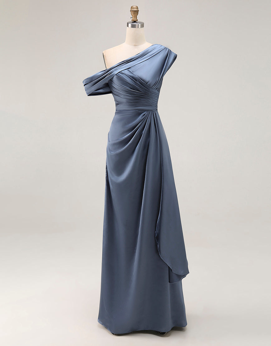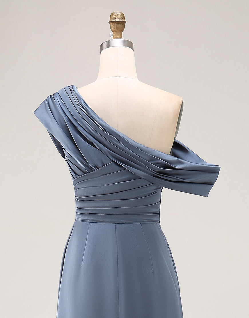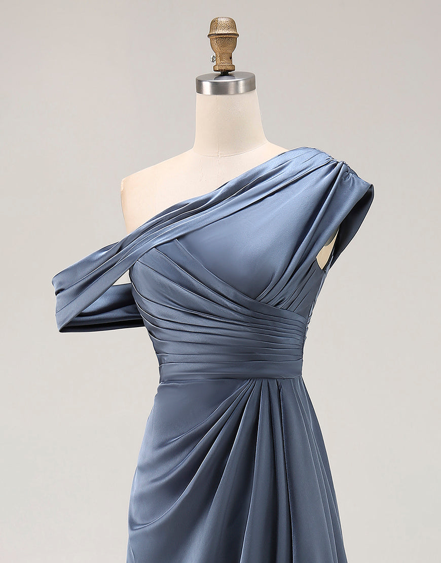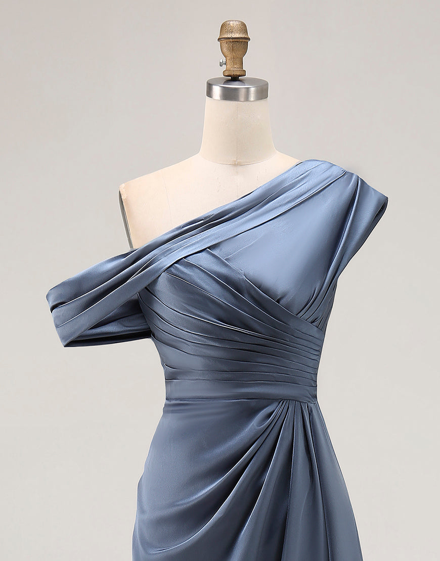 Sirena Gris Azul Un Hombro Satén Fruncido Madre De La Novia Vestido Con Volantes
