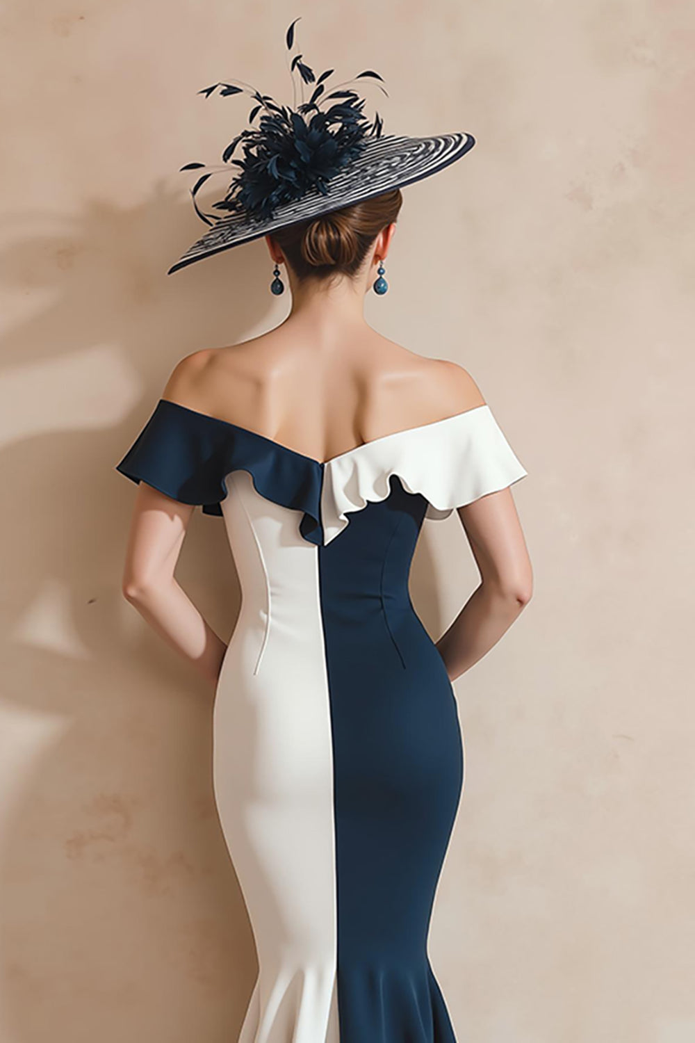 Vestido largo de sirena en blanco y negro con volantes y hombros descubiertos de la madre de la novia