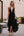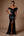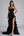 Elegante vestido formal largo negro con volantes y abertura