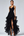 Vestido formal negro de organza con volantes alto y bajo