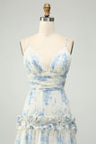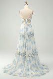 Flor Azul Blanco Una Línea Tirantes De Espagueti Vestido Largo De Tul De Dama De Honor Con Volantes