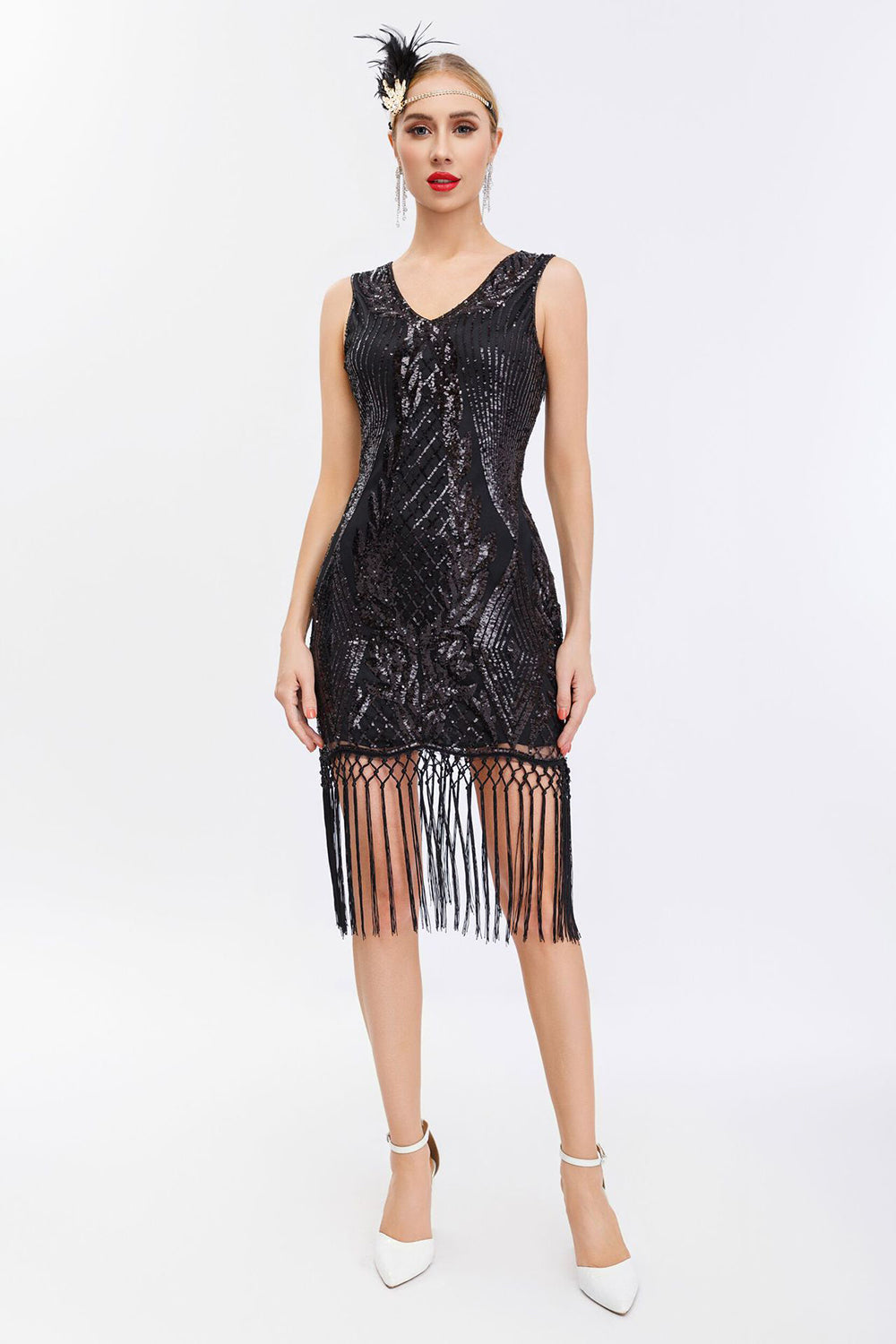 Vestido de Gatsby de la década de 1920 con escote en V dorado brillante con borlas